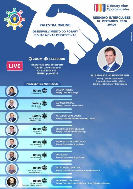 Na quinta-feira dia10 de dezembro de 2020, às 20h00, via plataforma Zoom Communications e Facebook (@RotaryClubDeSantosPorto), diversos clubes de Rotary realizam "Reunião Conjunta". Com o tema "DESENVOLVIMENTO DO ROTARY E SUAS NOVAS PERSPECTIVAS", o médico nuclear Adriano Valente será o palestrante da noite. A oportunidade está aberta ao público em geral. Contamos com a presença de todos. Junte-se a nós!