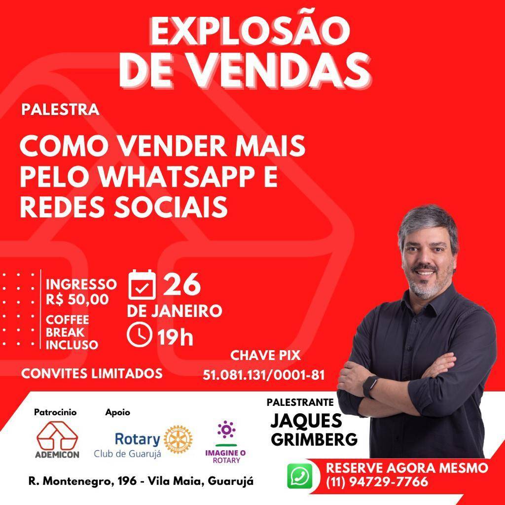 O rotary Club de Guarujá promoverá uma palestra hoje na sede ás 20:00 hs. título: Como vender mais pelo Whatsapp e redes Sociais.